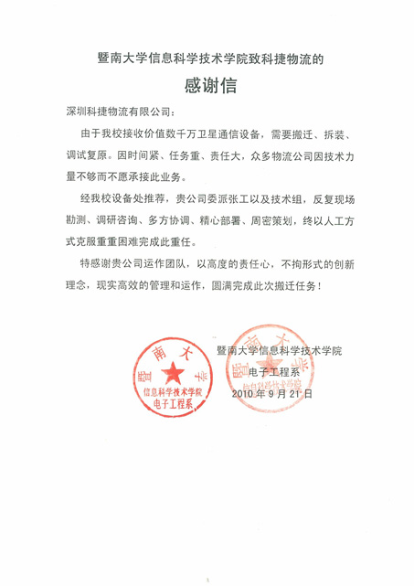 以下附暨南大學(xué)致科捷物流的感謝信: